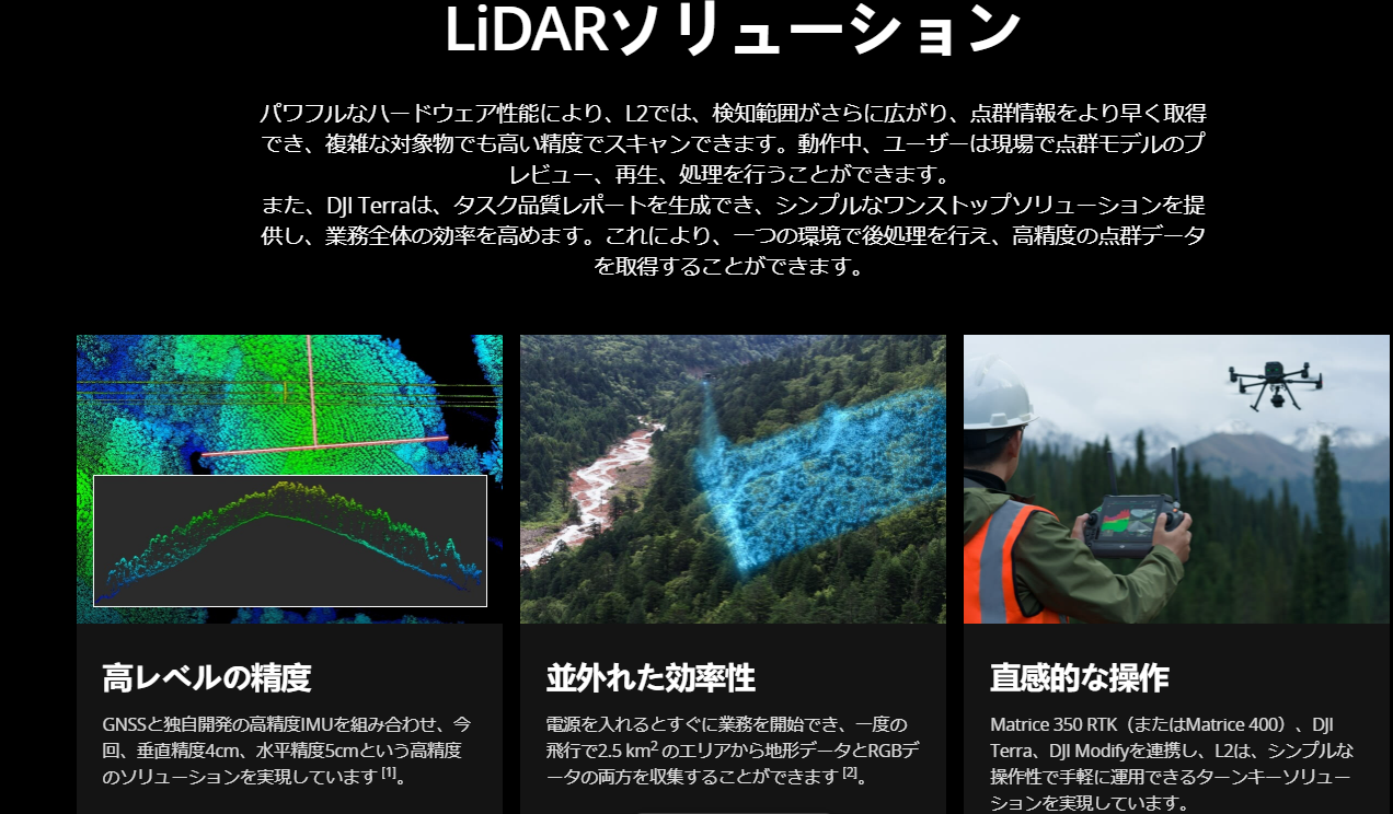 L2の最大の武器は、植生(木や草)があっても地表面のデータが取れること。 これで現場の伐採作業の手間が省け、大幅な省力化が実現します。
